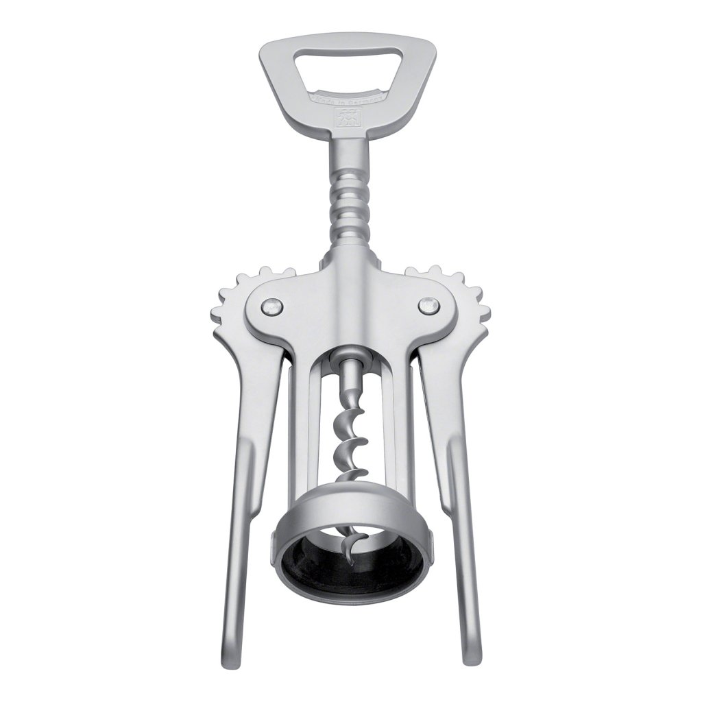 Saca-rolhas de asa da empresa alemã ZWILLING J. A. O Henckels de aço inoxidável niquelado será um bom ajudante para abrir garrafas de vinho ou tampas de coroa. É fácil de utilizar e funciona com base no princípio da alavancagem. Colocar o saca-rolhas na garrafa, rodar o manípulo, mas não segurar as "asas" - os braços da alavanca. Quando os dois braços estiverem levantados, basta empurrá-los para baixo lateralmente e o saca-rolhas puxará suavemente a rolha para fora da garrafa.