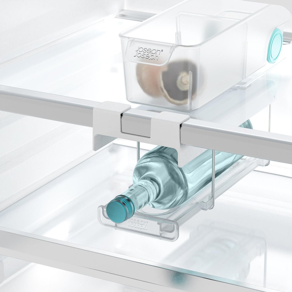 - O suporte dobrável para garrafas de frigorífico Joseph Joseph FRIDGESTORE é uma solução inteligente para guardar vinho ou champanhe de forma segura e organizada, sem ocupar espaço desnecessário.