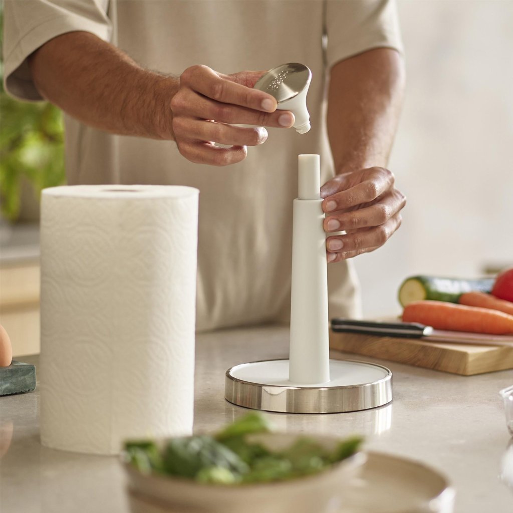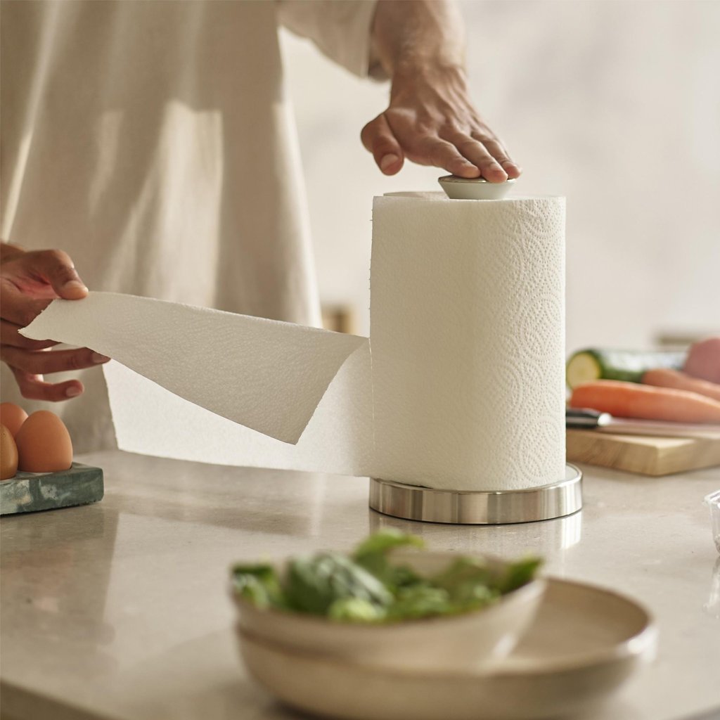 Quando estiver a segurar uma frigideira ou a mexer um molho, a última coisa com que quer lidar é uma luta complicada com um rolo de papel de cozinha. Aqui, basta pressionar ligeiramente por cima, o pano de prato fixa-se e o papel rasga-se sem uma batalha dramática.