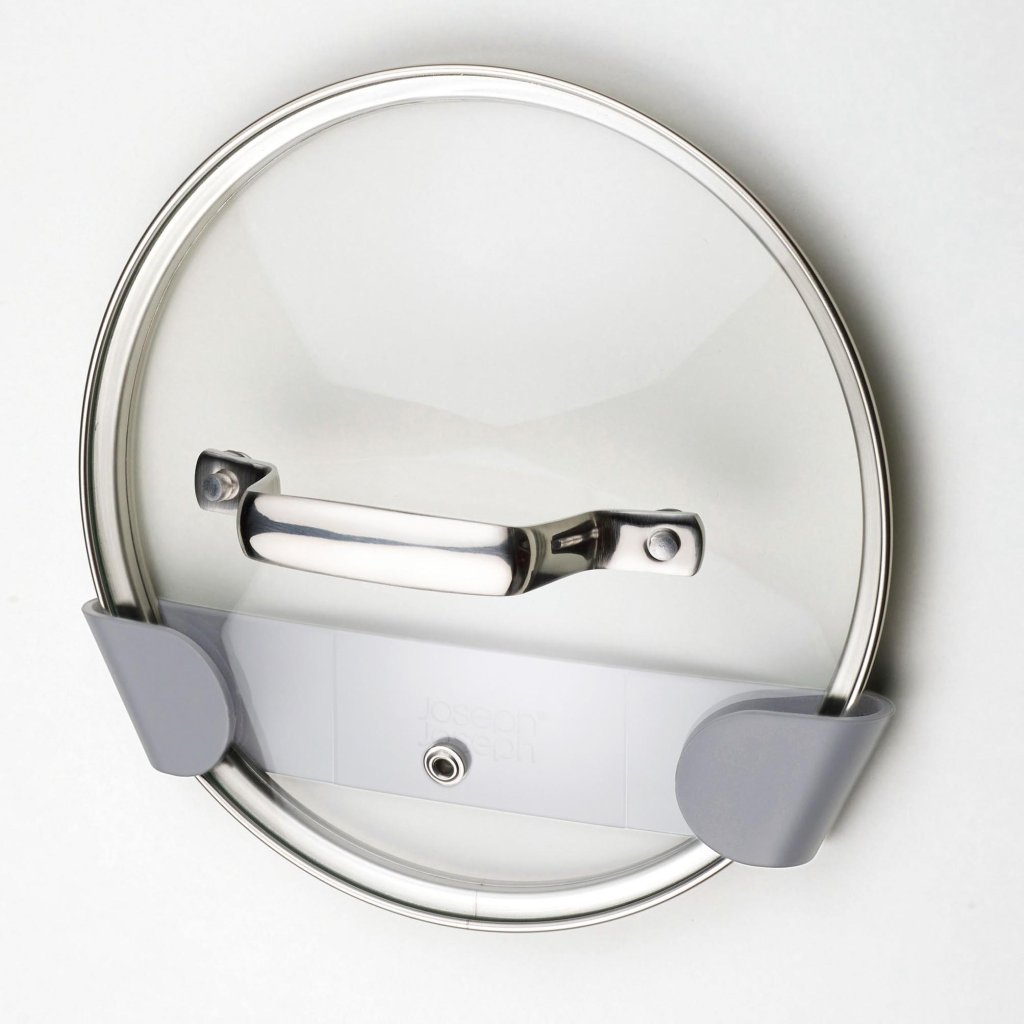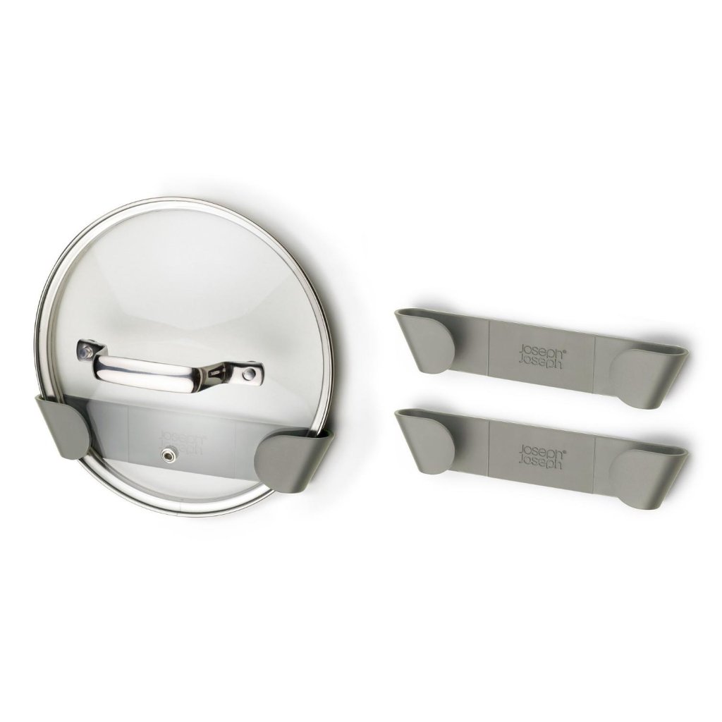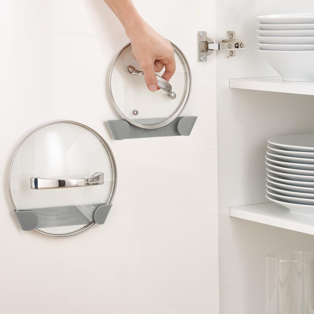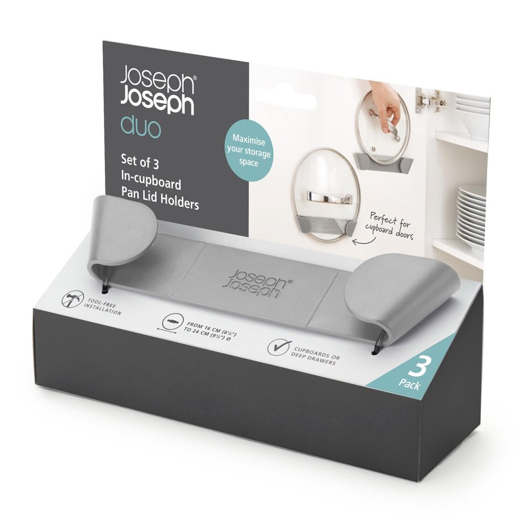 - O conjunto de 3 suportes autocolantes para tampas Joseph Joseph DUO representa uma solução prática para o armazenamento organizado e economizador de espaço das tampas dentro de armários ou gavetas de cozinha.