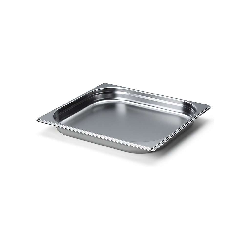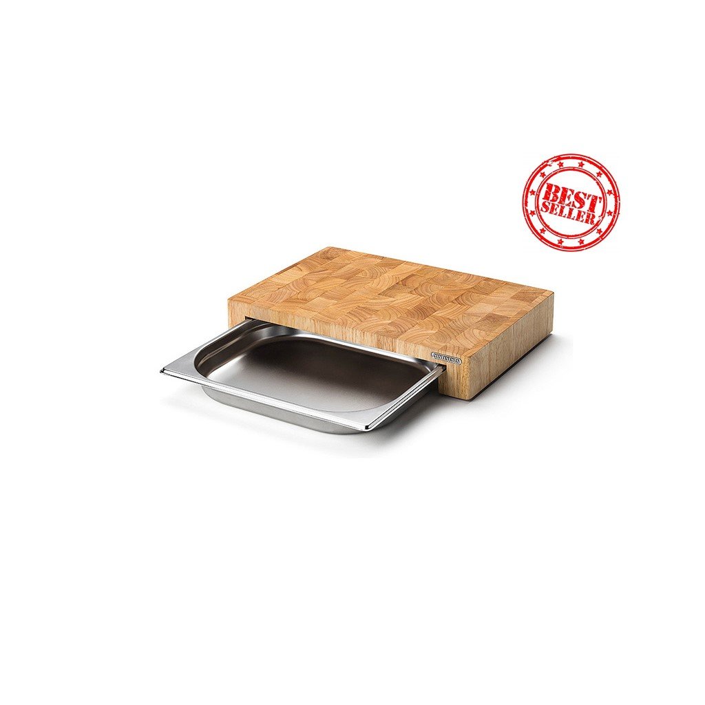 A tábua de cortar também inclui um tabuleiro de aço inoxidável, que é colocado por baixo da tábua de cortar e que serve de tabuleiro de servir ou de assadeira. É amovível de ambos os lados e pode ser lavado na máquina de lavar louça.