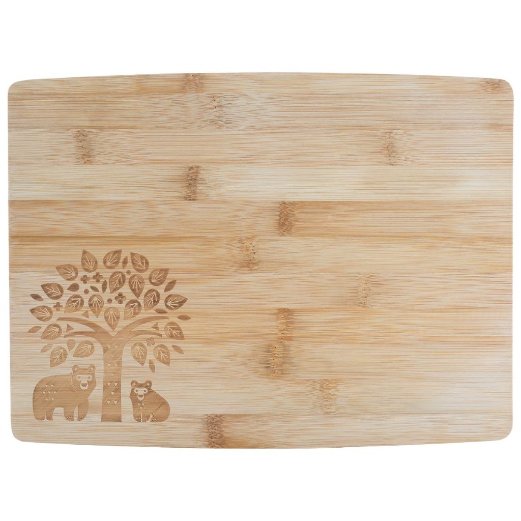 - placa de bambu com motivo gravado de ursos debaixo de uma árvore