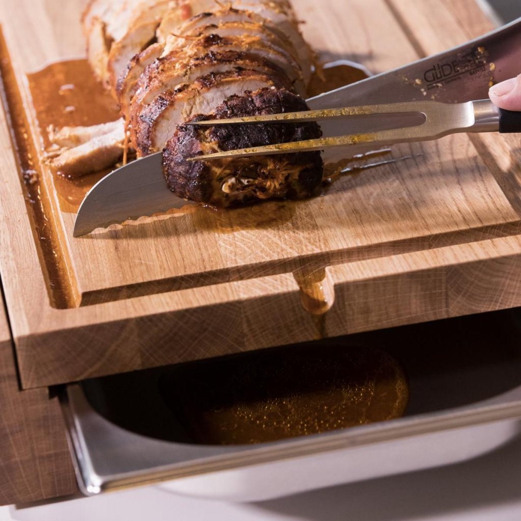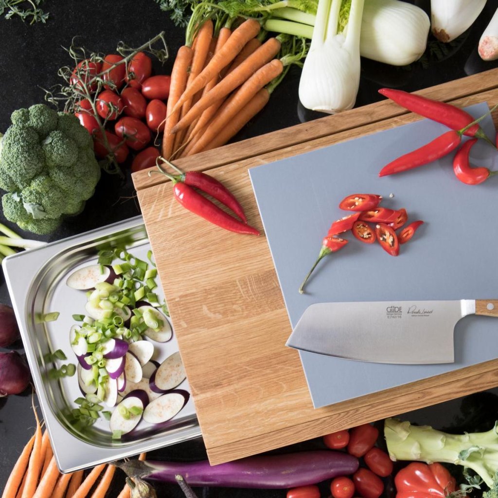- tábua de cortar com duas faces - um lado é liso, o outro lado tem uma ranhura para escorrer os sucos dos alimentos cortados