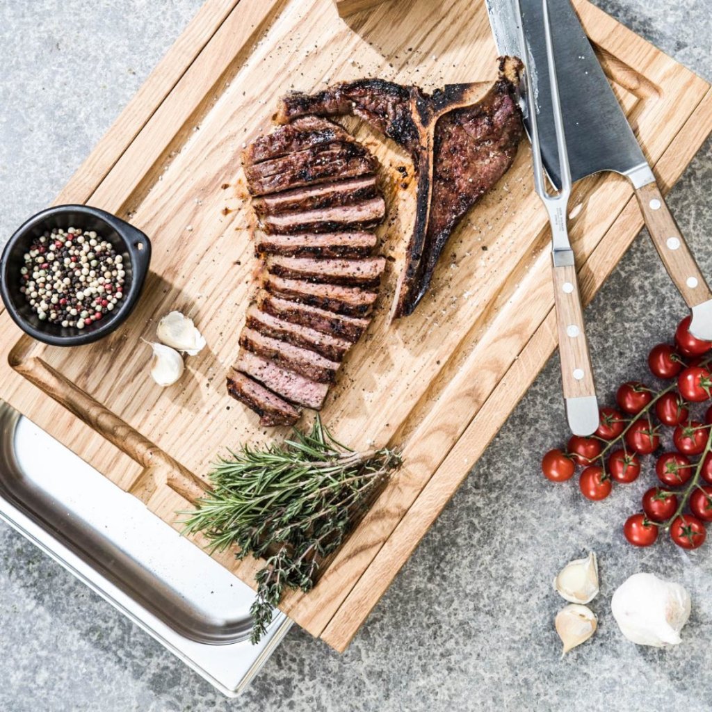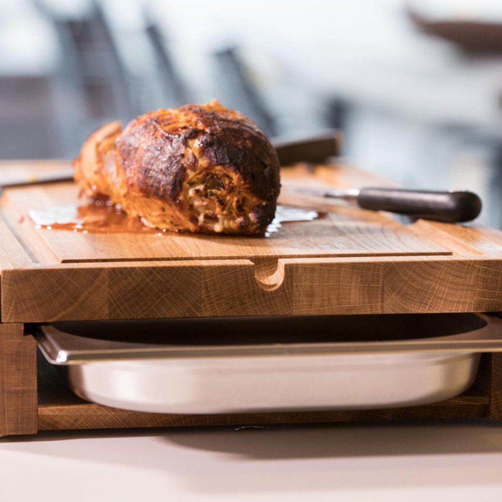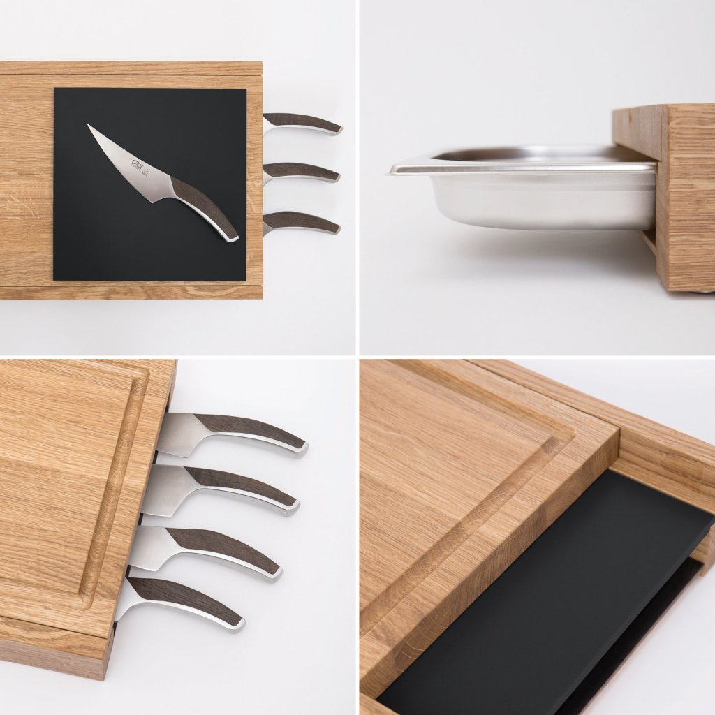 • inclui uma tábua de corte dupla face em madeira maciça, uma segunda tábua de corte em laminado de richlite, uma gaveta em aço inoxidável e uma calha magnética para facas