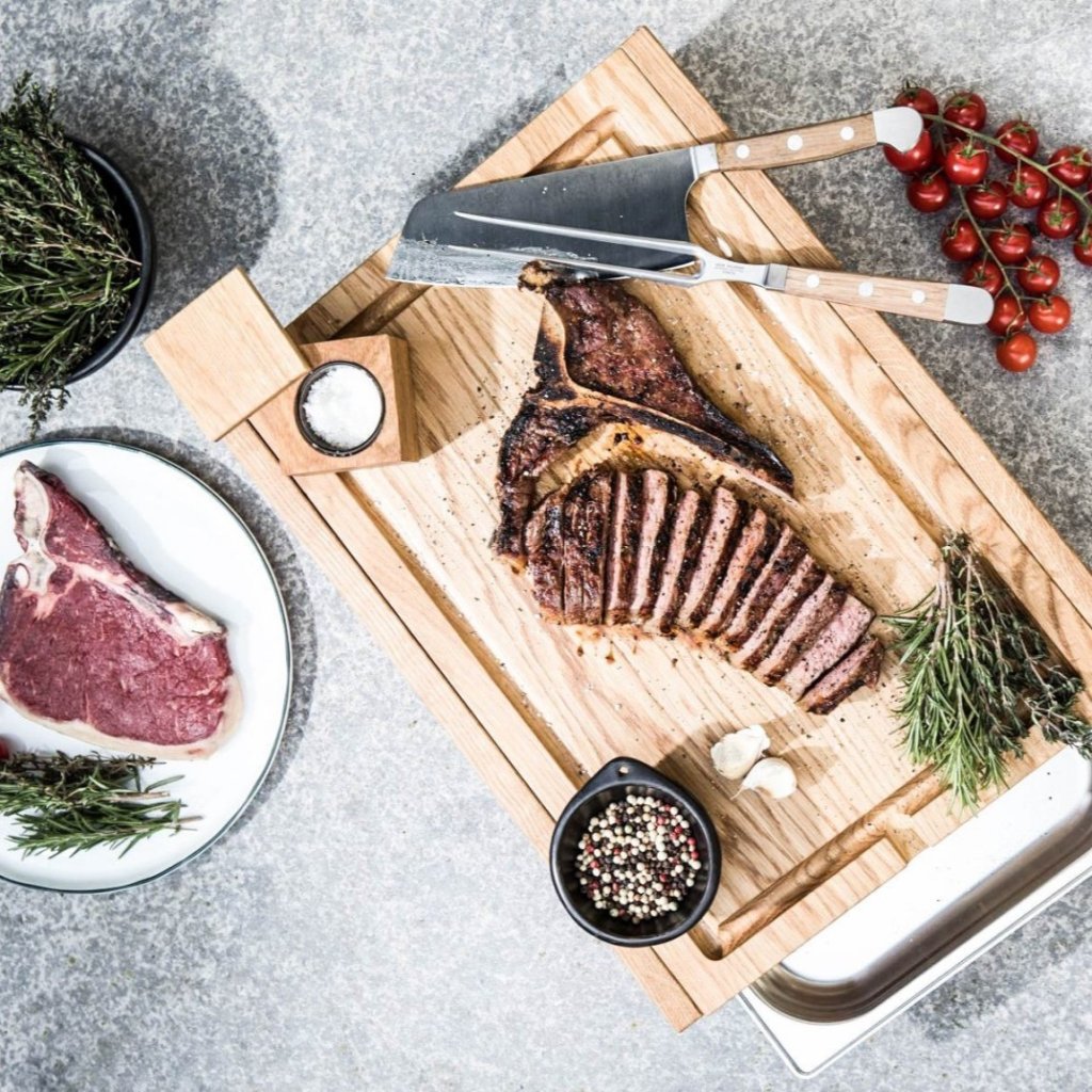 • tábua de cortar com duas faces - um lado é liso, o outro lado tem uma ranhura para escorrer os sucos dos alimentos cortados
