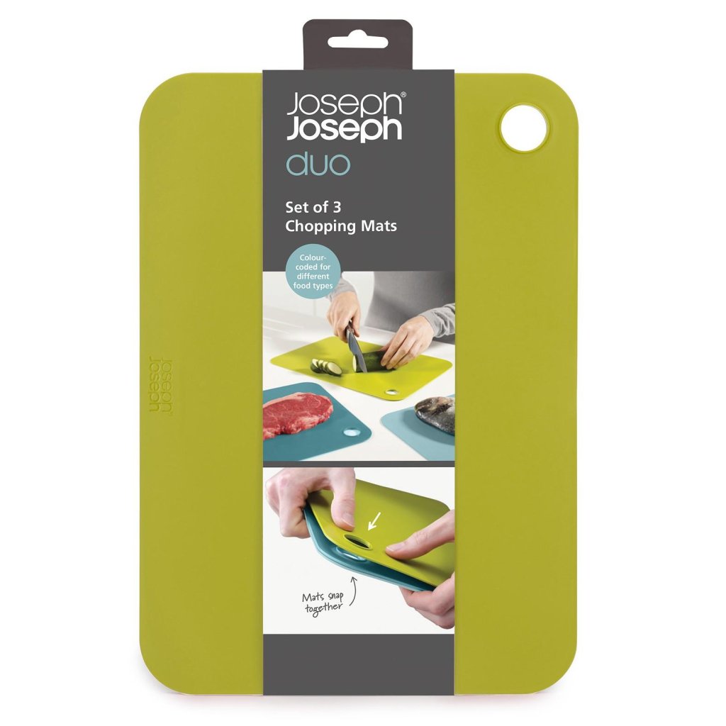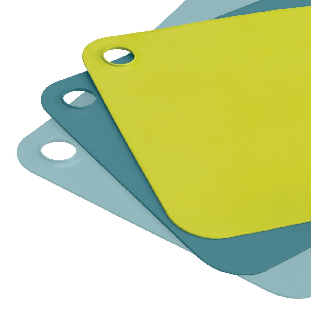 - O conjunto de três tábuas de corte Joseph Joseph DUO permite cortar higienicamente de forma separada vegetais, carne crua e alimentos já cozinhados.
