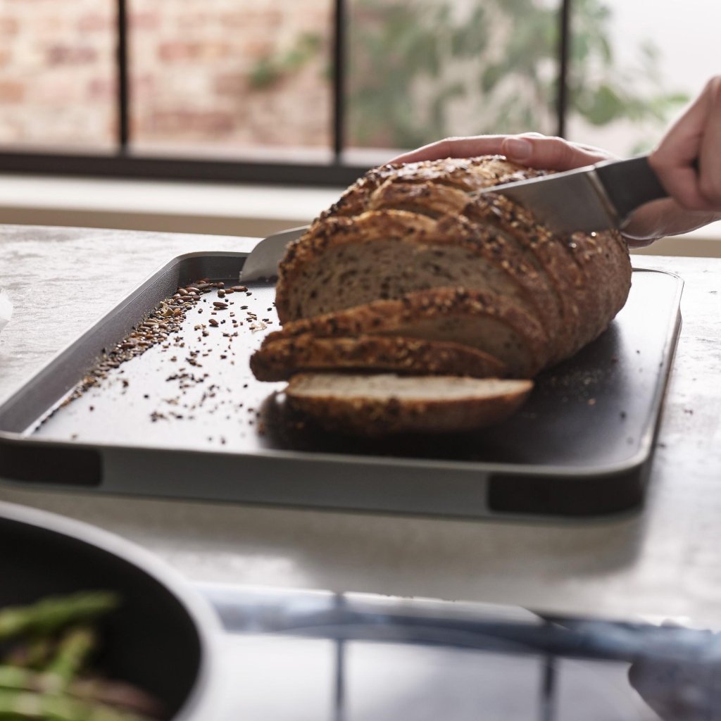 Algumas tábuas ficam apenas deitadas, à espera do que vai colocar nelas. Esta tem ambições. Corta, retém o sumo, segura a carne no lugar e ainda o ajuda a transferir tudo elegantemente para onde precisa. De repente, já não sente que está a lutar contra a gravidade, mas sim a colaborar com algo que sabe o que está a fazer.