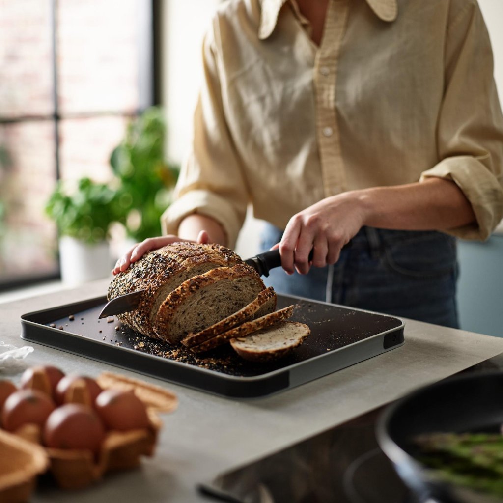 - O outro lado da tábua é liso, tornando-a ideal para cortar legumes, pão ou outros ingredientes comuns.
