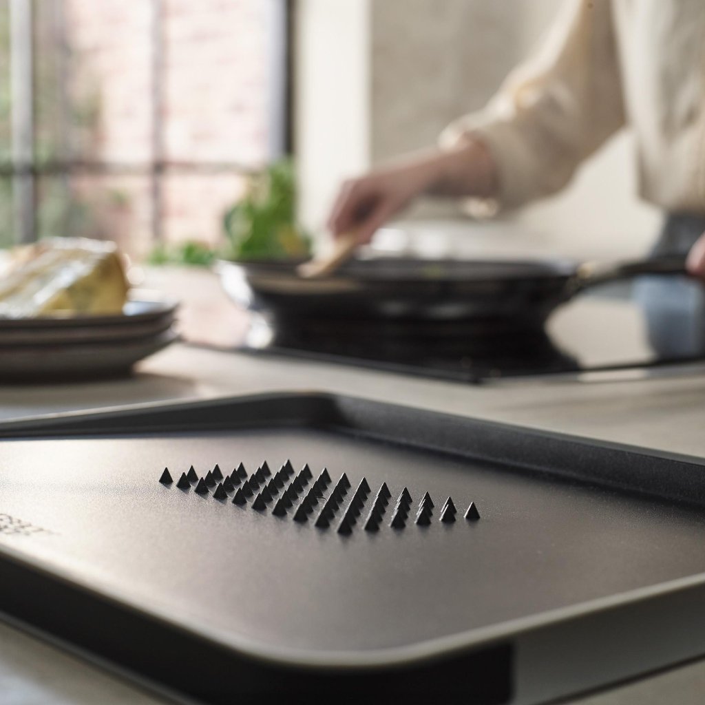 - Um lado está equipado com saliências antiderrapantes em forma de pirâmide que seguram firmemente a carne durante o corte e facilitam um corte preciso.