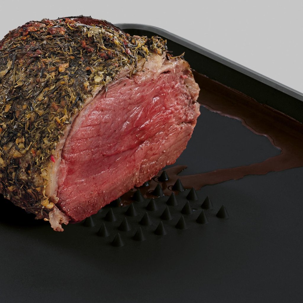 - O declive especialmente moldado direciona o sumo da carne ou fruta para a borda de drenagem, onde pode ser facilmente e de forma controlada escoado.