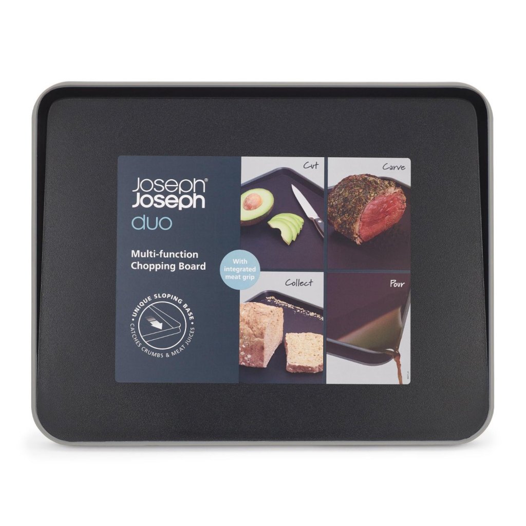 - A tábua multifuncional dupla Joseph Joseph DUO CUT&CARVE oferece um design inteligente com uma superfície inclinada para a drenagem eficiente de líquidos durante o corte.