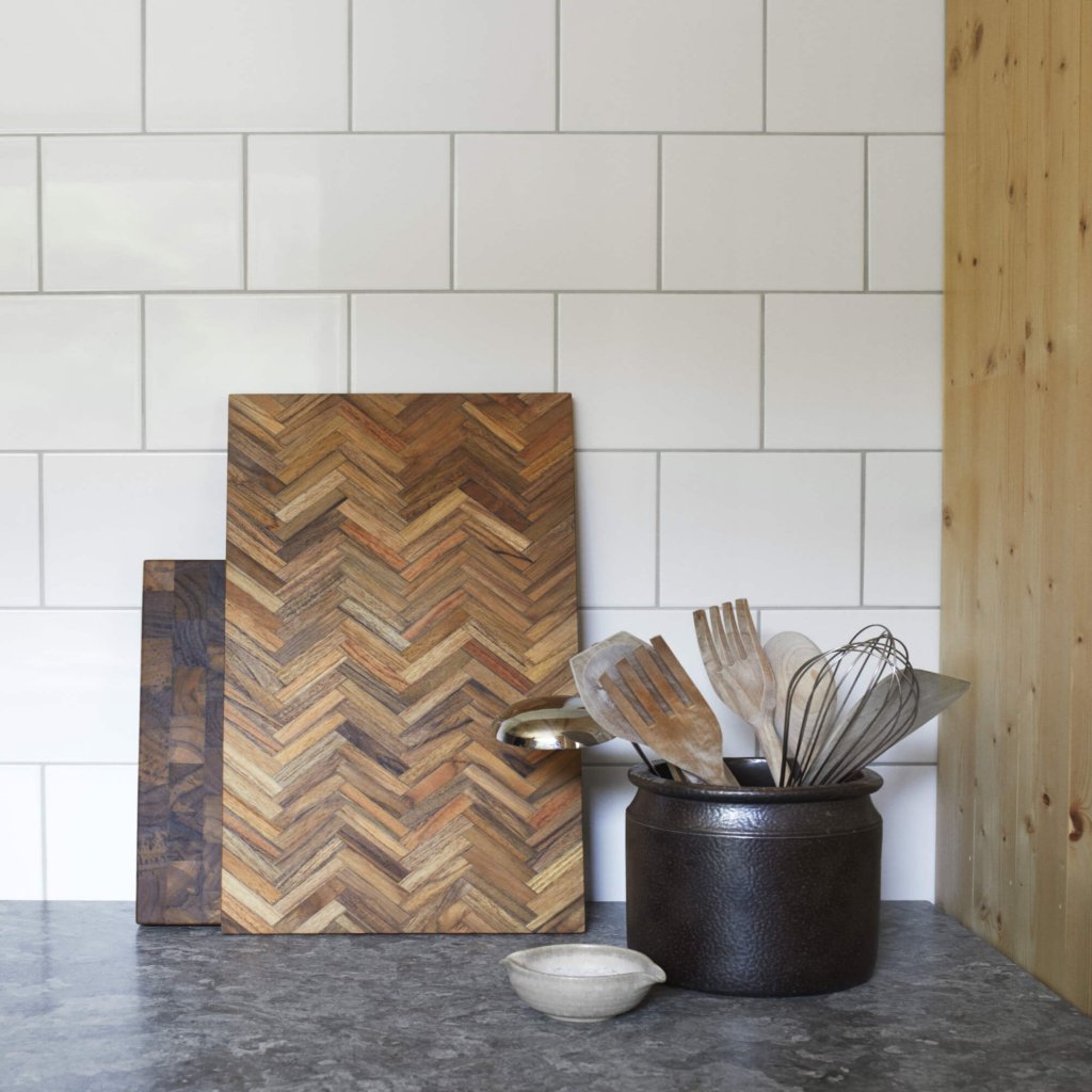 - cada peça é única graças à utilização de pequenos pedaços de teca, que criam um mosaico dinâmico de cores e texturas