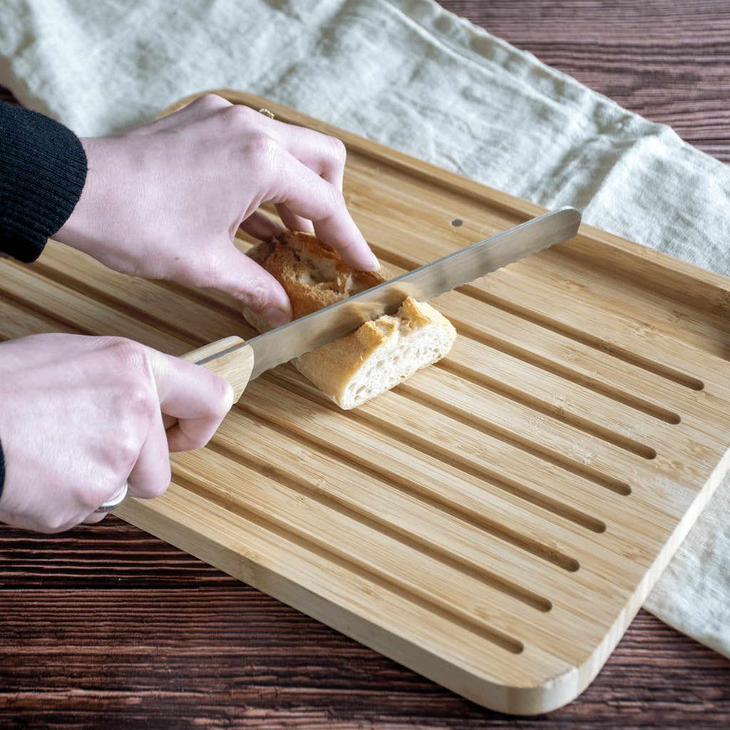 - O conjunto de tábua de pão e faca de bambu Pebbly oferece uma solução elegante e prática para fatiar pão no dia a dia sem sujeira desnecessária.