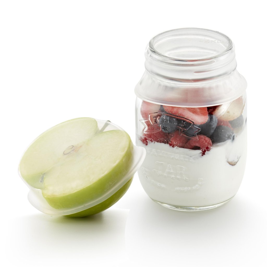 - Este conjunto de 2 tampas de silicone reutilizáveis Lékué com 8,5 cm de diâmetro serve para armazenar alimentos como uma alternativa prática e ecológica às embalagens descartáveis.