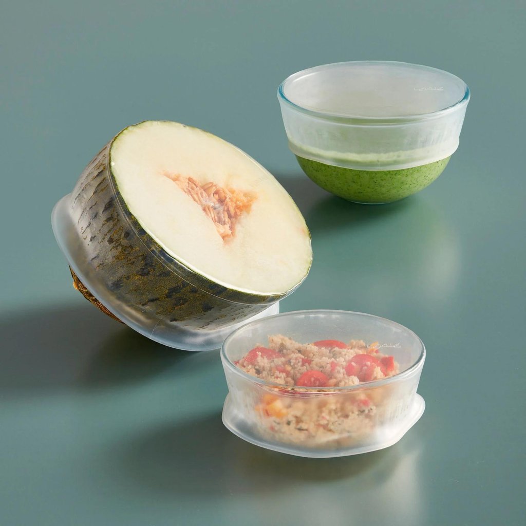 - Este conjunto de 3 tampas de silicone reutilizáveis Lékué é usado para armazenar alimentos como uma alternativa prática e ecológica às embalagens descartáveis.