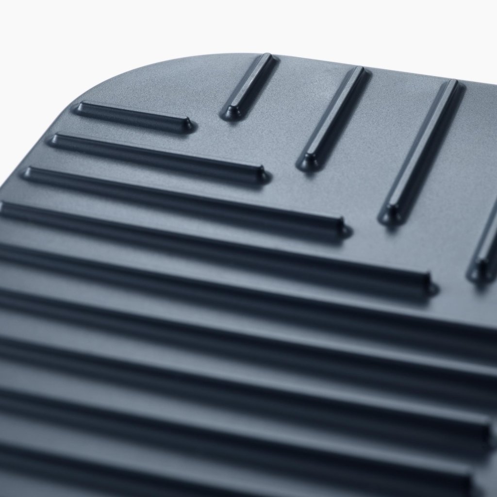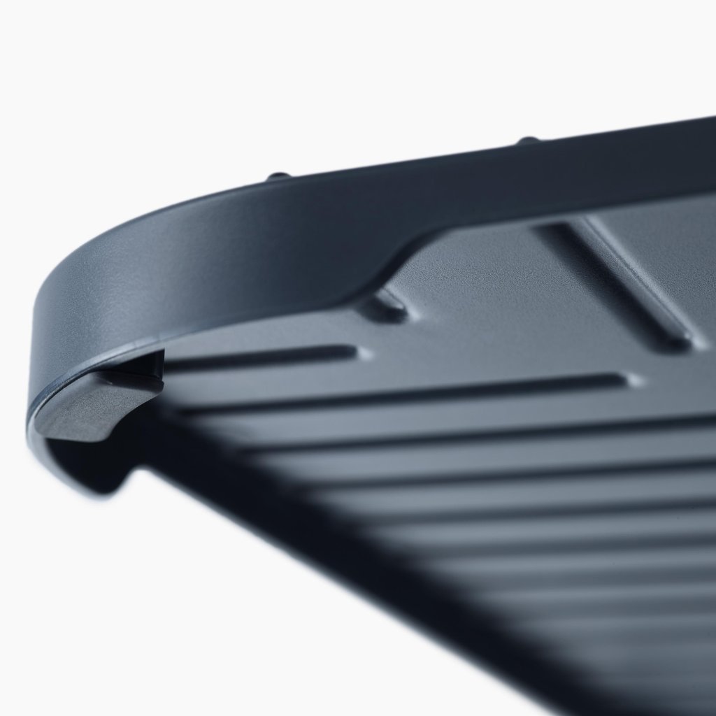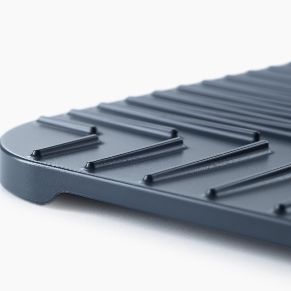 - As ranhuras integradas na superfície direcionam a água para o centro da proteção, permitindo que a água escoe facilmente e que a loiça seque mais rapidamente.