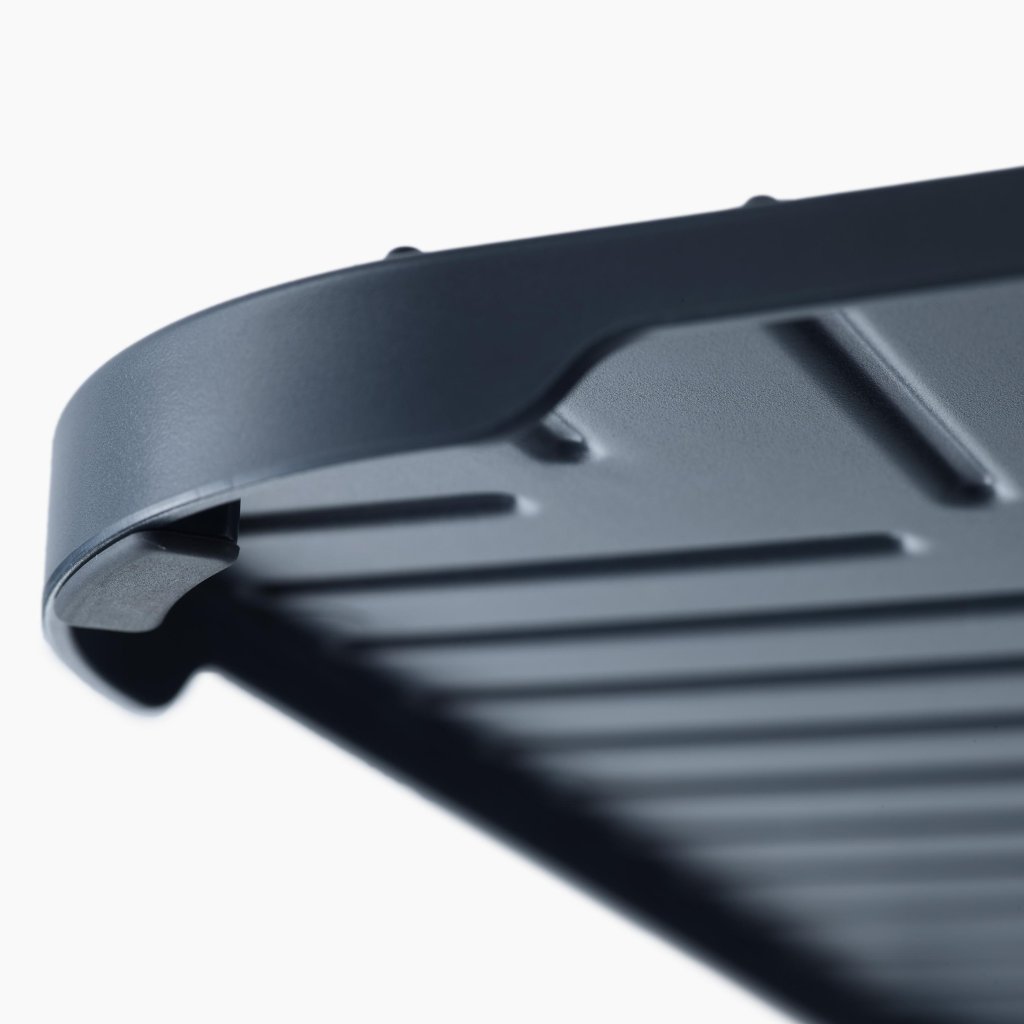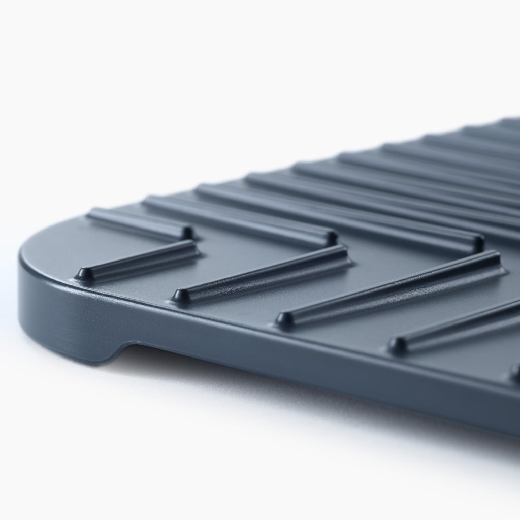 - As ranhuras integradas na superfície direcionam a água para o centro da proteção, permitindo que a água escoe facilmente e que a loiça seque mais rapidamente.
