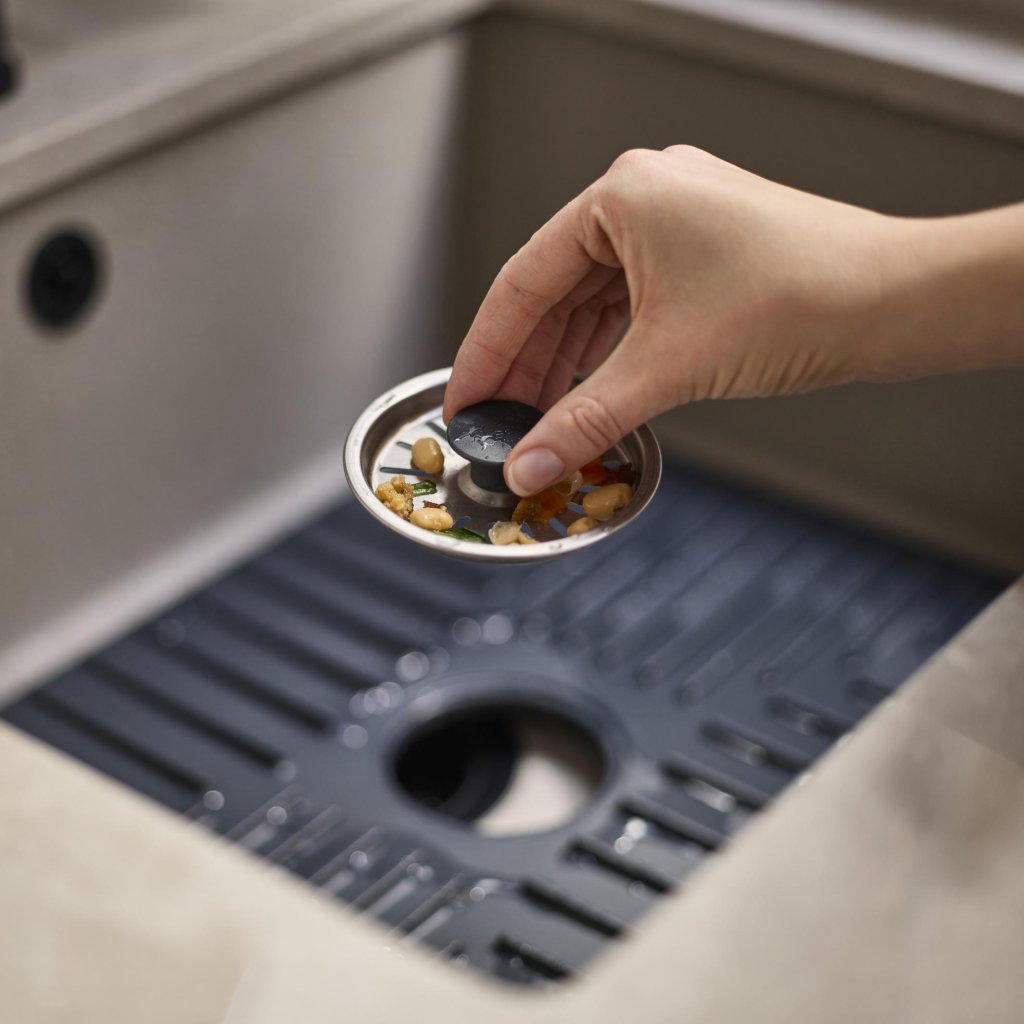 - Uma solução prática que ajuda a evitar o entupimento do ralo e facilita a manutenção da pia durante a lavagem diária da loiça.