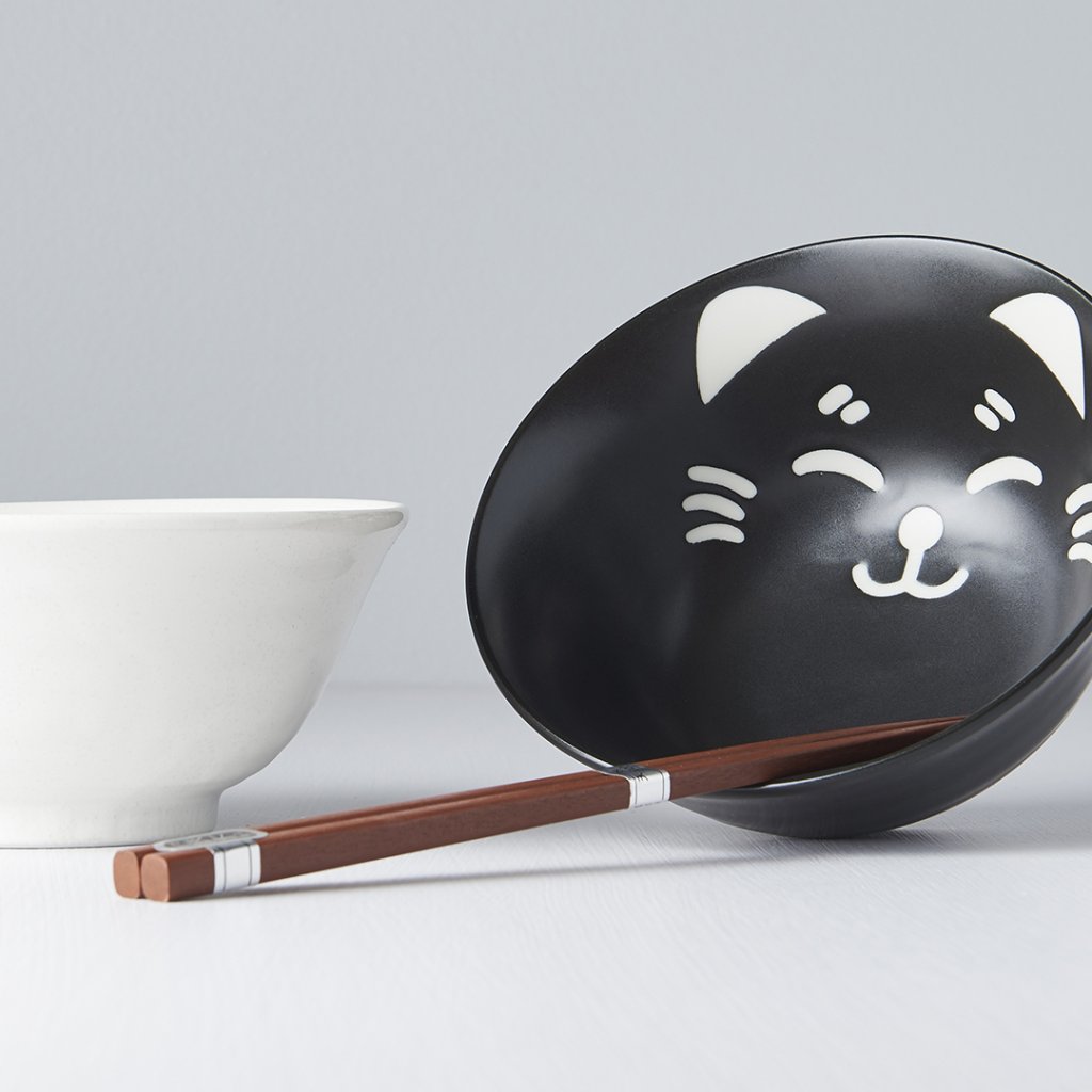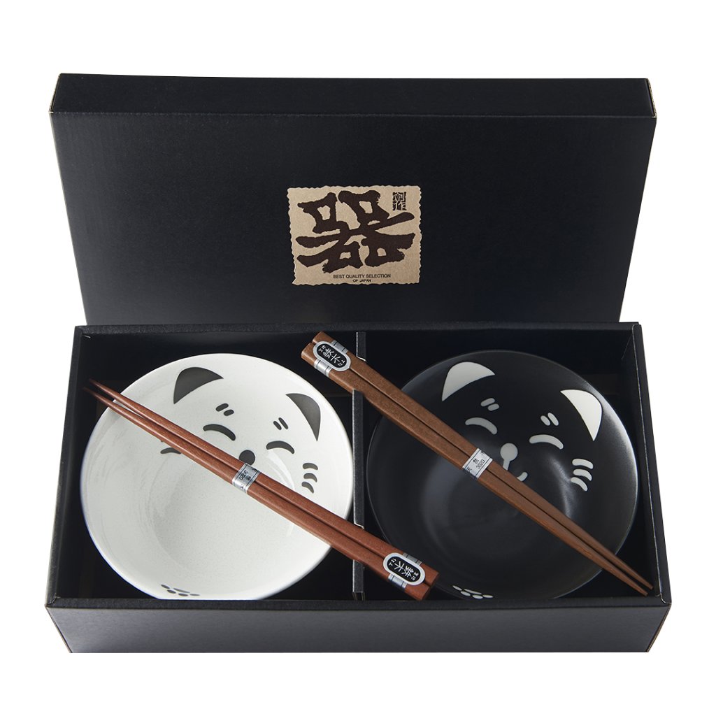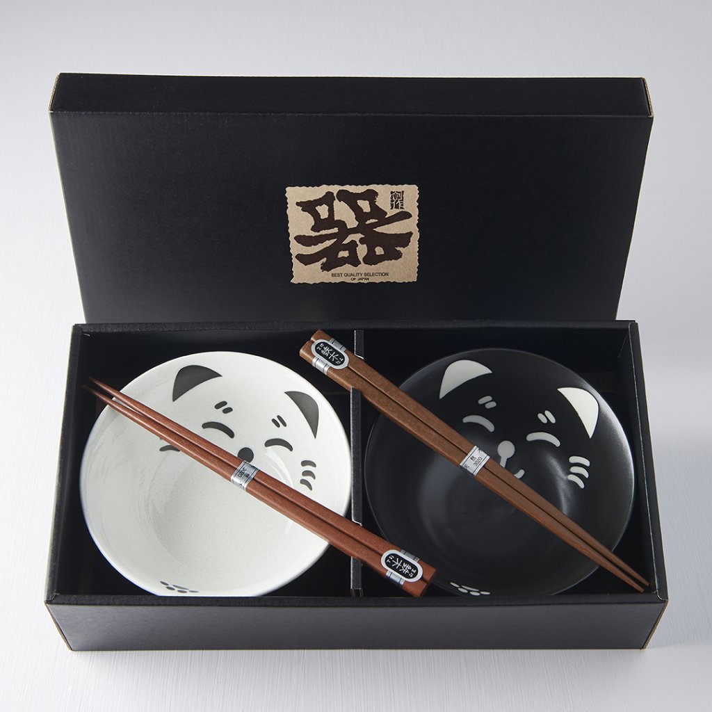 O conjunto inclui 2 pares de pauzinhos de madeira e 2 tigelas em preto e branco com desenho de cara de gato. Este conjunto é apresentado numa elegante caixa de oferta preta e é, por isso, adequado como presente para amigos ou parceiros de negócios.