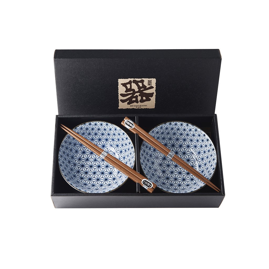 O conjunto inclui 2 pares de pauzinhos de madeira e 2 tigelas em branco com padrões geométricos azuis. O bordo das taças é decorado com uma fina linha prateada. Este conjunto é apresentado numa elegante caixa de oferta preta e é, por isso, adequado como presente para amigos ou parceiros de negócios.
