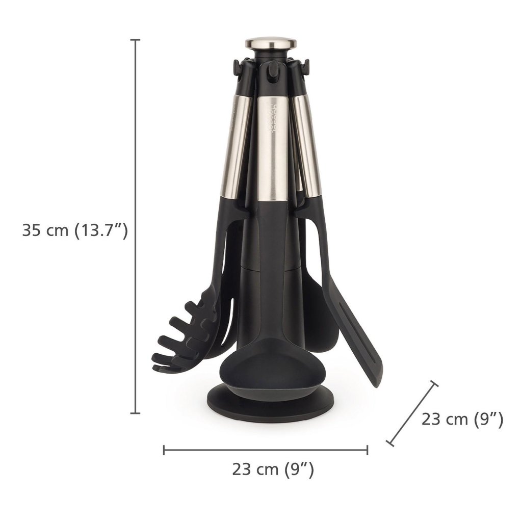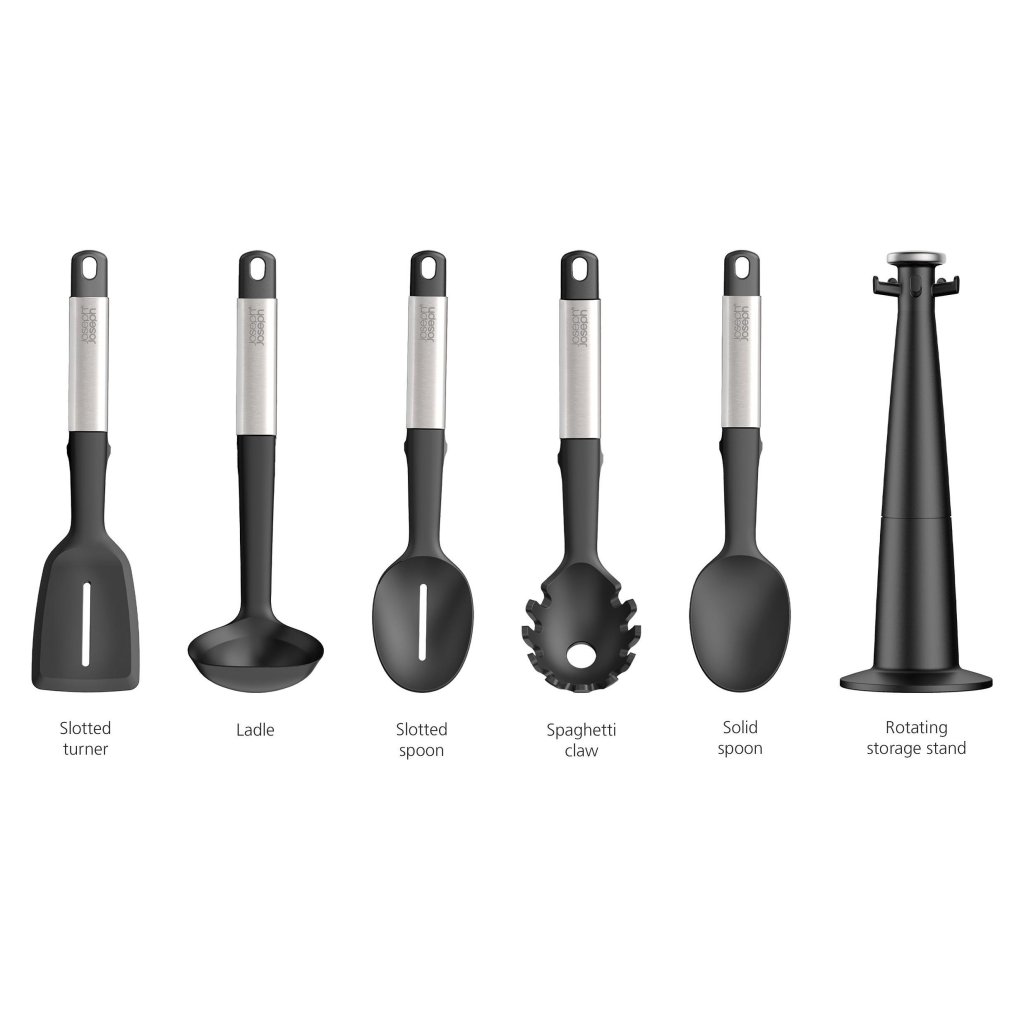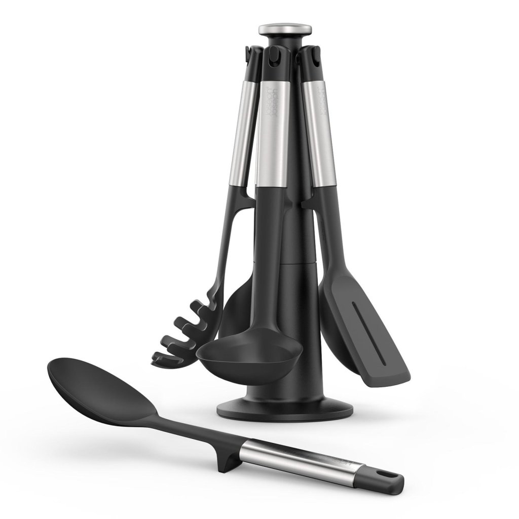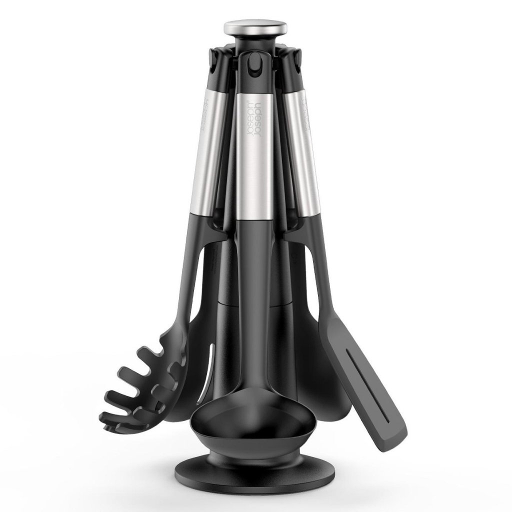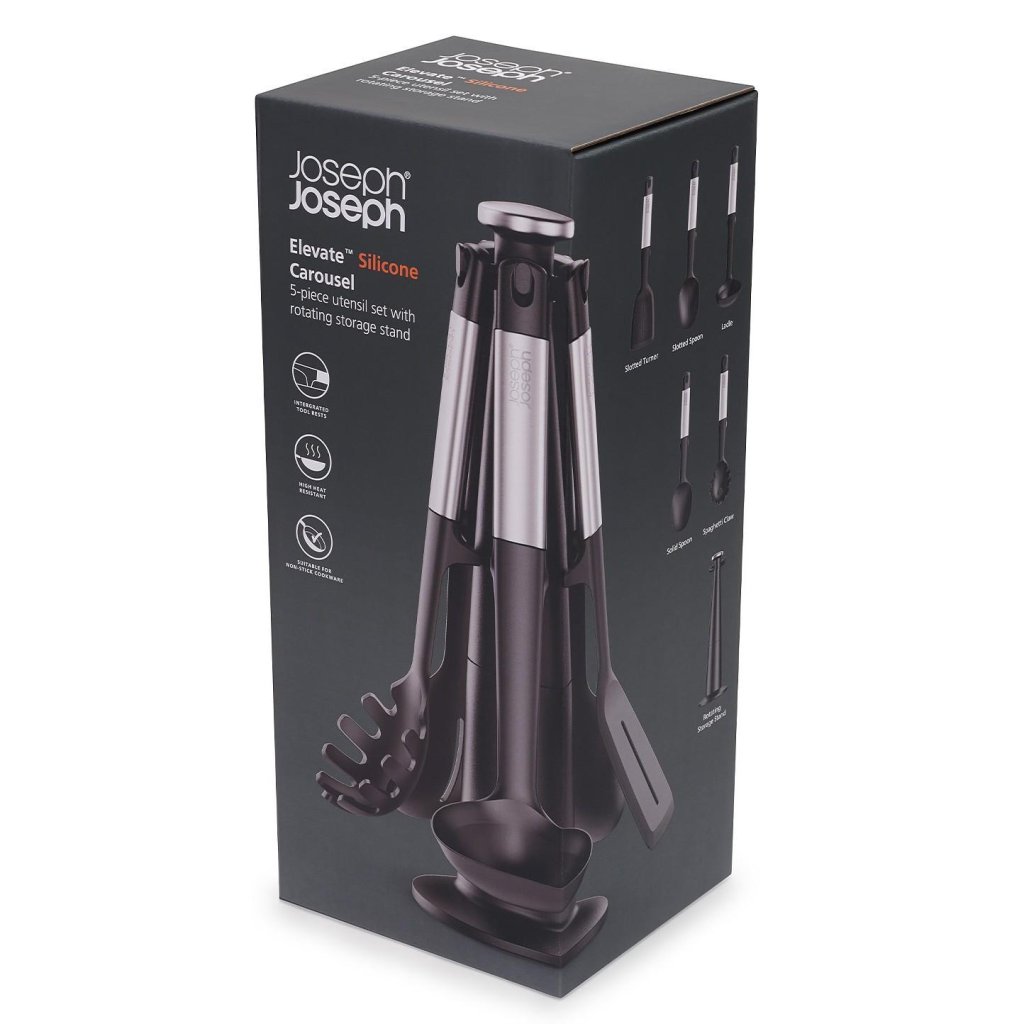 - O conjunto de utensílios de cozinha Joseph Joseph ELEVATE é uma solução prática para o dia a dia na cozinha, pois oferece cinco ferramentas essenciais armazenadas em um suporte giratório para fácil acesso.